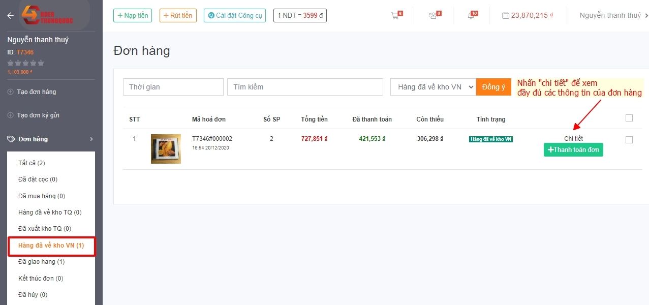 Sau khi hàng được vận chuyển về đến kho của ODTQ tại Việt Nam. Đơn hàng sẽ tự động chuyển trạng thái sang “Hàng đã về kho VN”. Bước cuối cùng là thanh toán và nhận hàng.