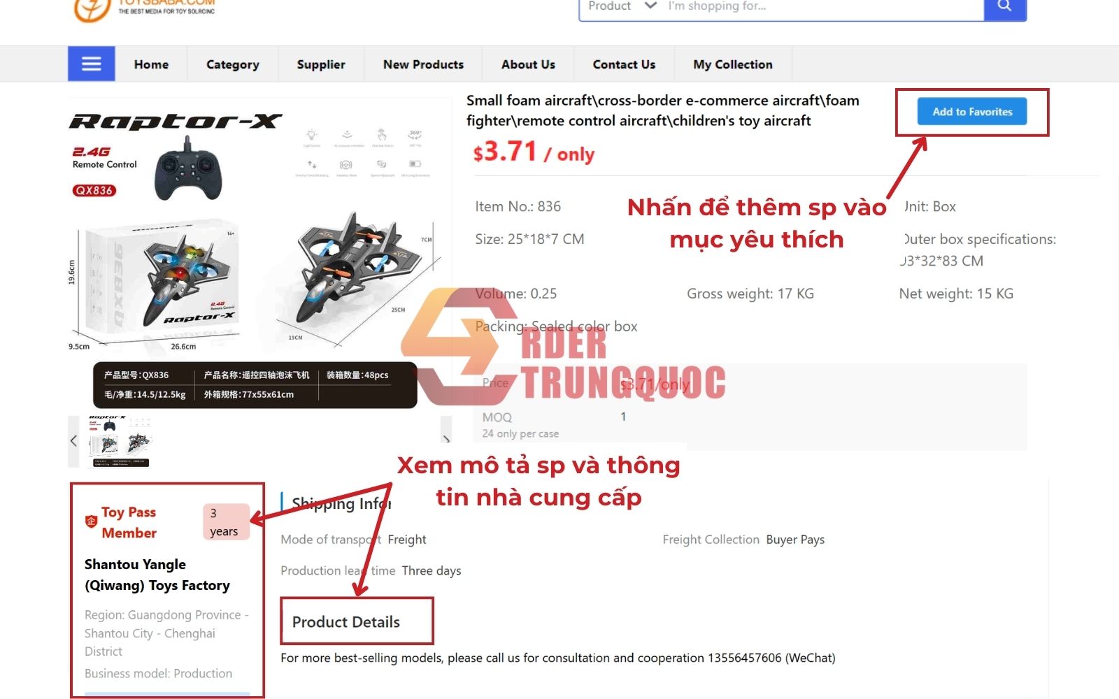 Sau khi chọn được sản phẩm phù hợp, bạn hãy nhấn vào sản phẩm đó để xem thông tin chi tiết. Tại đây, hãy kiểm tra kỹ mô tả sản phẩm trong mục “Product Details” và đánh giá độ uy tín của nhà cung cấp ở phần thông tin bên trái. Để dễ theo dõi và trao đổi sau này, bạn nhấn “Add to Favorites” để lưu sản phẩm vào danh sách yêu thích, chuẩn bị cho bước đặt hàng tiếp theo.
